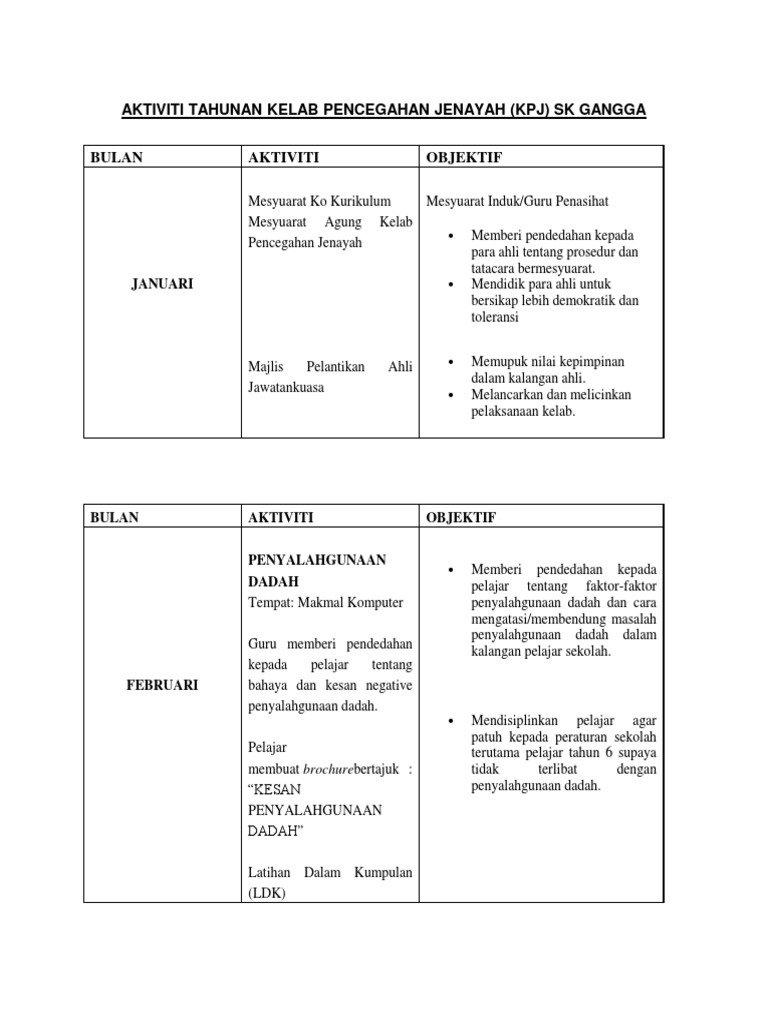 1 from Kelab pencegahan jenayah beri pendidikan untuk murid. Ahli jawatankuasa kelab pencegah jenayah telah memilih kawasan untuk menyedia Selamat datang ke blog ahli kelab pencegahan jenayah. Latar belakang kpj kelab pencegahan jenayah ialah kelab yang ditubuhkan di semua sekolah rendah dan sekolah menengah cadangan aktiviti kelab pencegahan jenayah 1. Disini saya sertakan perlembagaan kelab pencegahan jenayah yang telah saya ubah suai mengikut kesesuaian sekolah saya. Kelab pencegahan jenayah ialah kelab yang ditubuhkan di semua sekolah rendah dan sekolah menengah kerajaan merujuk kepada surat pekeliling ikhtisas bil 5/2006 4. (c) setiap ahli yang menghadiri mesyuarat atau perjumpaan yang dianjurkan oleh persatuan hendaklah mengikut tatatertib mesyuarat atau persatuan dan berpakain yang sesuai. Memberikan khidmat nasihat dalam perlaksanaan aktiviti kelab pencegahan jenayah.