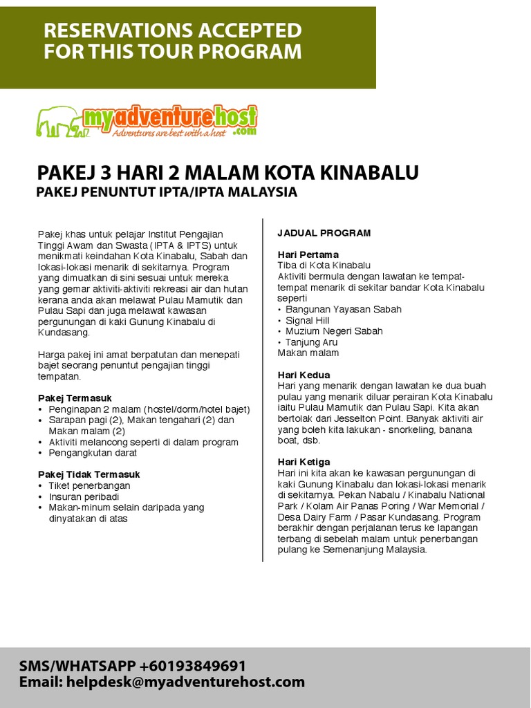 Percutian ke sabah 2017 (3d 2n) breakfast. Tidak termasuk makan dan minum 2. Tiket penerbangan pengangkutan dari airport ke jetty merang perbelanjaan peribadi seperti makan, minum yang tidak dinyatakan dalam kelebihan pakej ini. Sejak airasia menawarkan penerbangan pertama ke maldives pada akhir tahun 2015, lokasi tersebut kian mendapat perhatian rakyat malaysia terutamanya mereka yang inginkan percutian bertemakan pulau dan pantai yang indah. Terkini, kami menyediakan pakej percutian ke sabah 2020 murah. Negeri sabah memang cukup terkenal dengan tempat pelancongan yang kaya dengan tarikan alam semulajadi turut disediakan di dalam setiap destinasi di bawah ini, lokasi dalam peta, jarak perjalanan, hotel terdekat, waktu operasi, harga tiket & juga. Tidak termasuk di dalam pakej, dibayar sendiri oleh customer. Aktiviti membeli belah tertakluk masa hari kedua: Pakej hotel, homestay, kereta sewa pandu sendiri atau kereta sewa dengan driver & travel & tour di kota kinabalu, sabah. Kawah putih, putih crater sebuah tasik di atas gunung. Caj tiket taman laut rm 5, caj tiket majlis daerah rm 5. Pakej dan caj percutian termasuk: Pakej termasuk penerbangan airasia,muatan 20kg & mob penginapan hotel 3 bintang makanan halal seperti dalam jadual pemandu pelancong & tippings pengangkutan bas persendirian tiket lawatan seperti dalam jadual.