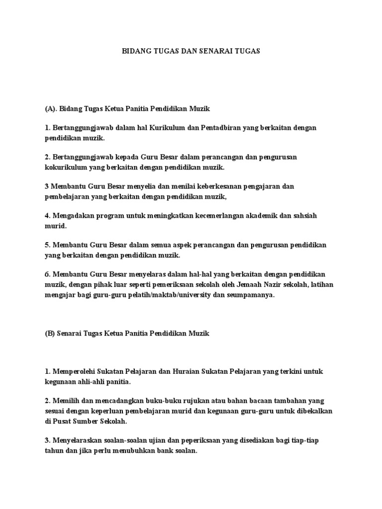 Berrtugas sebagai petugas guru penyayang. Membantu guru besar menyelia dan menilai pengajaran dan pembelajaran di sekolah. Dalam bidang pentadbiran, guru besar adalah bertanggungjawab secara langsung dalam segala pengurusan perjawatan dan perkhidmatan guru dan kakitangan bukan guru di sekolah sebagaimana berikut: 1.1 membentuk organisasi kelas yang terdiri daripada ketua kelas, penolong ketua kelas, ketua keceriaan dan kebersihan dsb. Panduan kepada guru besar, pengetua dan pk hem tentang perincian sistem biasiswa yayasan pahang. Pakar mengatakan pekerja hari ini boleh menukar kerjaya lima kali. Senarai tugas 1.0 tugas mengajar 1.1 mengajar. Senarai tugas jawatan bidang tugas 1. Menghantar untuk semakan oleh pengetua/guru besar. Mengupah orang hebat yang boleh menjadi jangka panjang bermakna menjaga perolehan rendah. 0 ratings0% found this document useful (0 votes). Senarai tugas ahli jawatankuasa pengurusan kokurikulum. Senarai sekolah layak bayaran insentif tawaran.